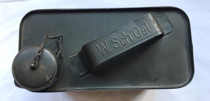 In very nice condition a MG 34/42 Weapon Oil Can 'W.Sch.Oel'. This example retains 99% of the original factory paint, it is also nicely factory code marked 'cjs' and waffenamt marked.