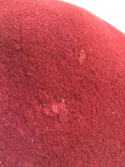 unfortunately the beret has been damaged by moths, the moth holes are repaired shown on the pictures.