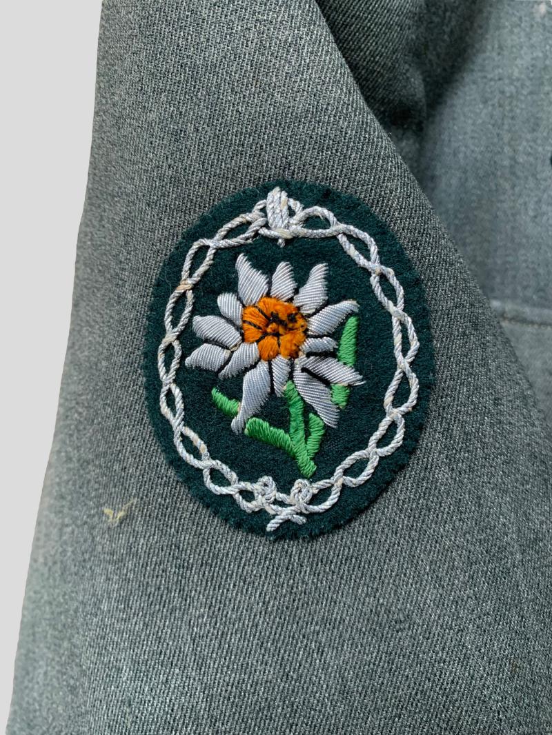 In really top condition a M36 Mountain Troops 'Gebirgsjäger' Officers Tunic (Ober Leutnant), the tunic it-self is made of the so-called italian 'Garbadine', which comes with all insignia original applied on the tunic. (on the sleeve is a fantastic embroided 'Edelweiss'.