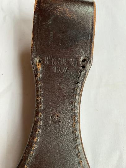 The chocolate brown leather frog is nicely maker marked and dated 1937.