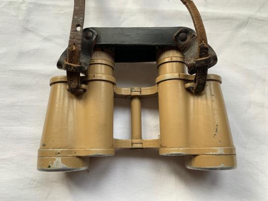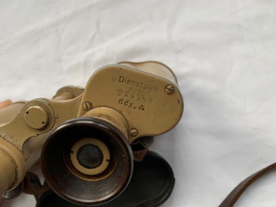 In very nice condition a German WW2 Tan 6x30 Binoculars, this example retains more then 90% of the original tan paint. It comes with a original leather carrying strap and Bakelite protective lens-cover.