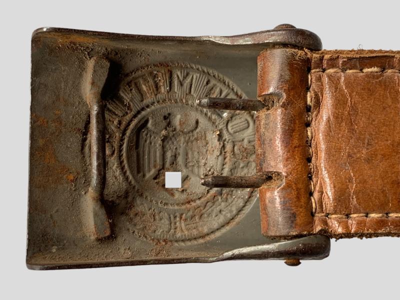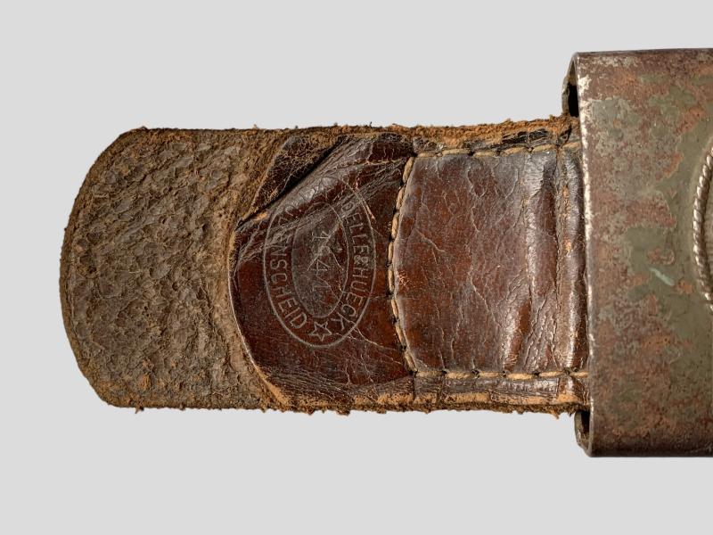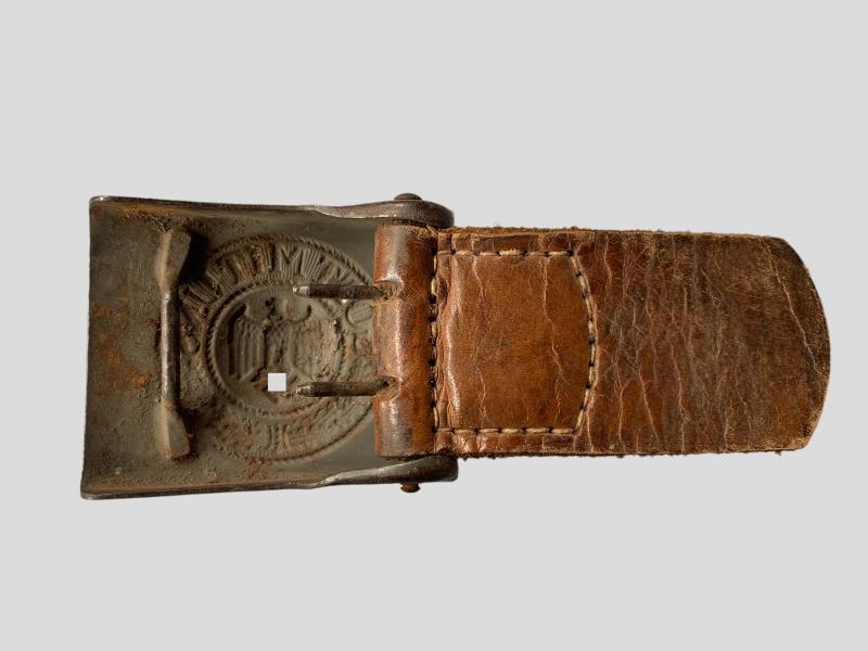 In nice used condition a WH (Heer) Steel Belt Buckle which retains more then 60% of the original factory paint, it comes with the original leather tab which is nicely maker marked and dated '1941'
