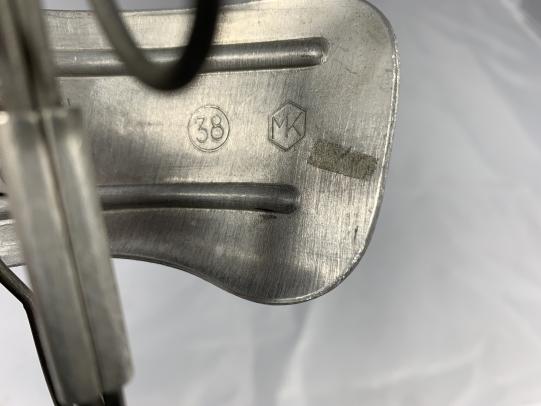 In nice condition a German Gasmask Shape Retainer Frame made of aluminum and magnetic spring wire construction gasmask shape retainer features a curved, "T" shaped aluminum "forehead" and "nose" panel.