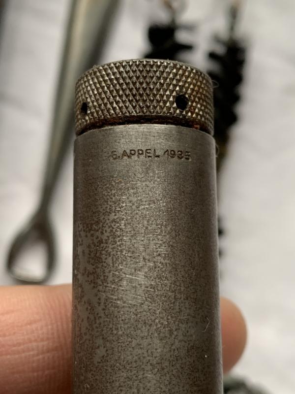 In very nice condition a K98 Rifle Cleaning Kit which is nicely maker marked ‘mundlos’ and dated ‘1935’ also the WaA stamp is still visible.