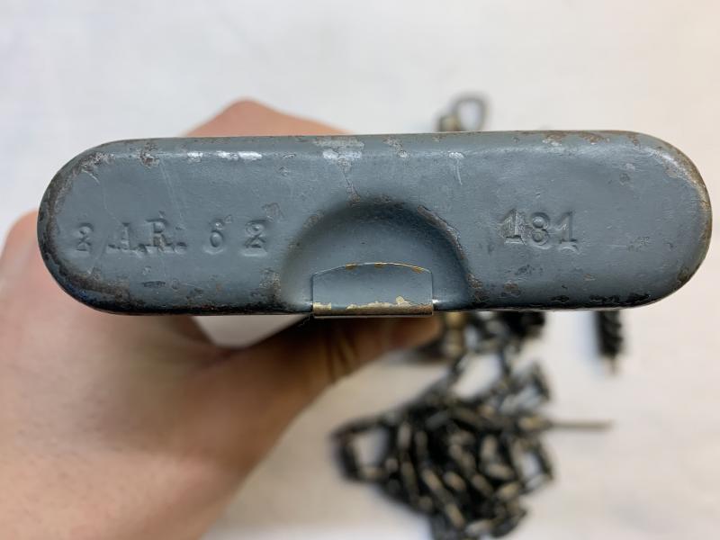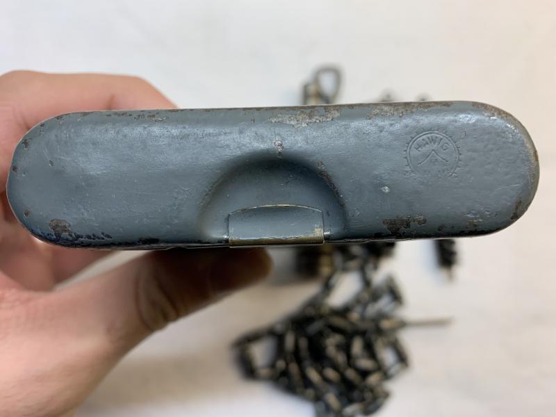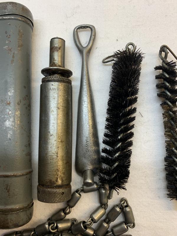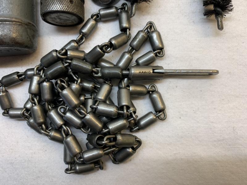 Very nice K98 Rifle Cleaning kit which is nicely marked with 2/A.R. 62 181 also maker marked 'Hawig', the chain, oiler and take down tool are all three marked with 'Hawig', also it comes with the 2 brushes.