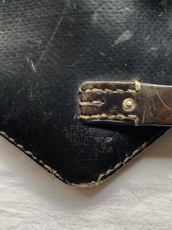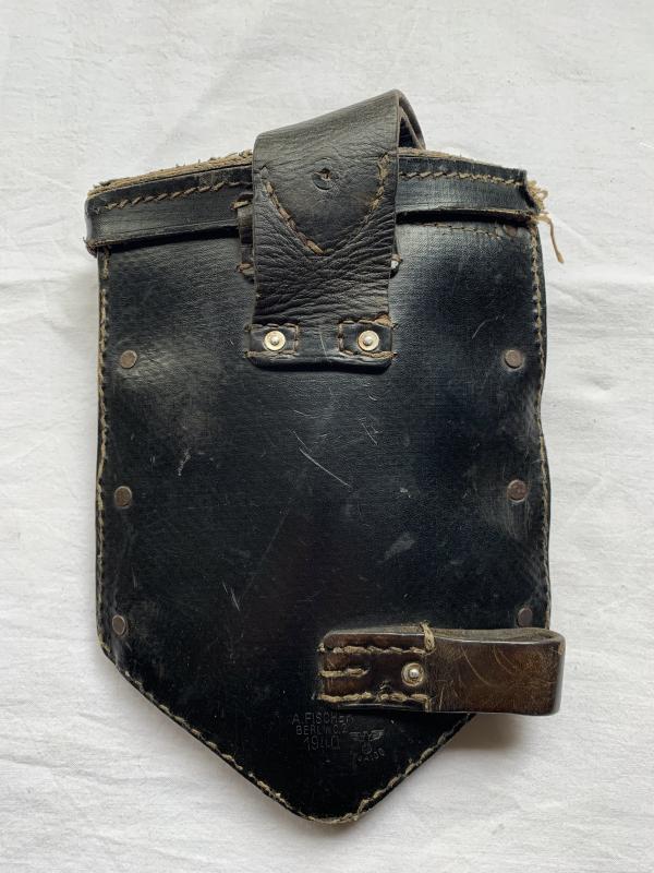 In nice used condition a Folding Shovel Carrying Case, 1st Model which is nicely maker marked 'A. Fischer Berlinc 2' and dated '1940'. It has a small damage shown on the pictures.