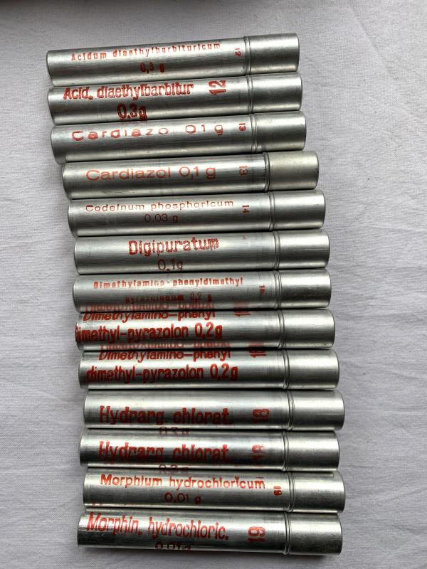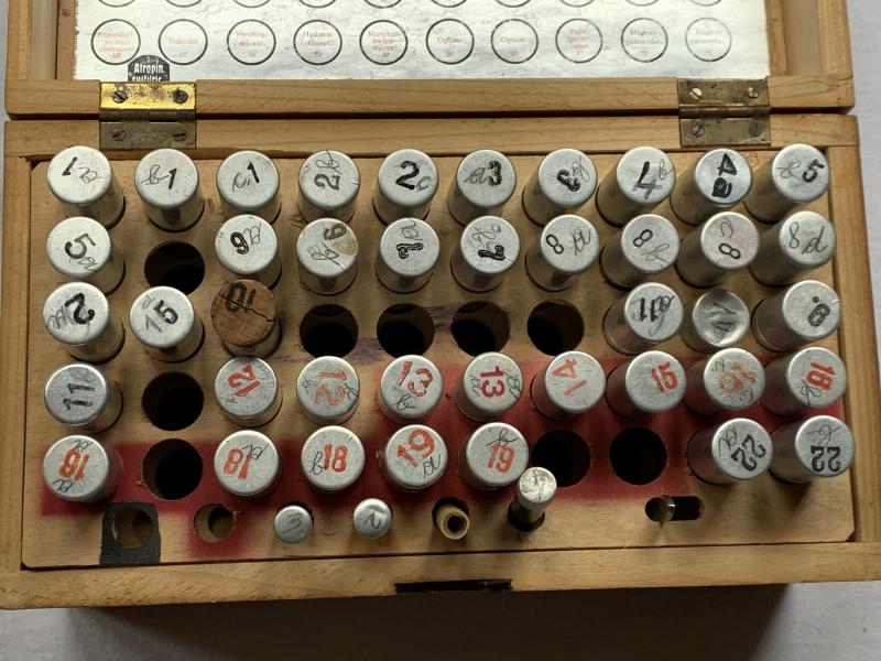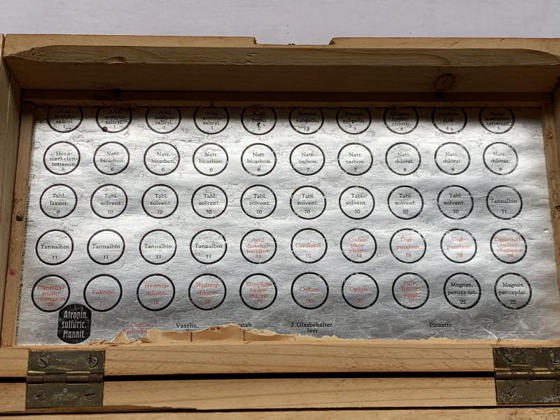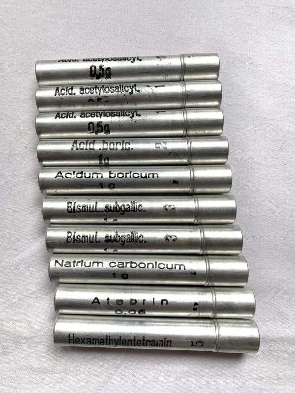 Very nice WH (Heer) Medical 'Einheitstablettenkasten' that comes with almost all tubes (empty) for medical tablets. Nice and rare example! Approximately size (23x12,5x12,5cm)