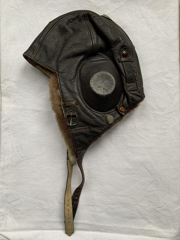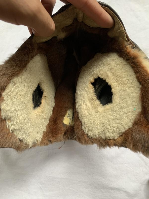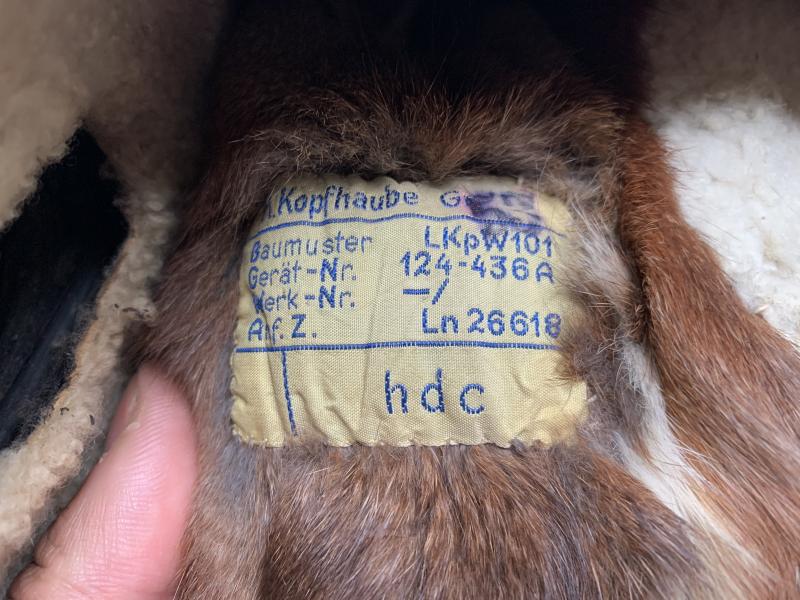 Very nice Luftwaffe Winter Flight Helmet 'Fliegerkopfhaube', with original applied manufacturers tag. Unfortunately the throat microphones are missing. Nice and fair priced example.