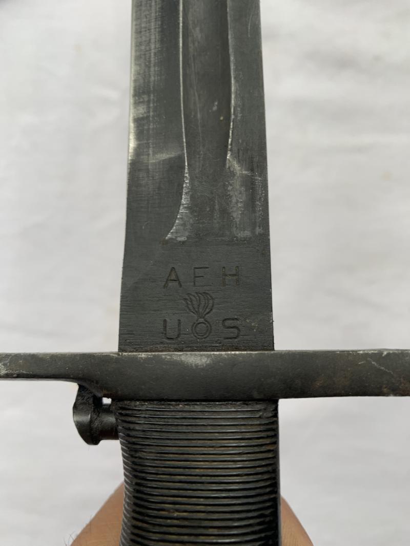 In nice used condition an U.S. M1942 Garand Bayonet which comes with the original scabbard, the bayonet and scabbard are both nicely marked with 'U.S.', the bayonet is also factory code marked.
