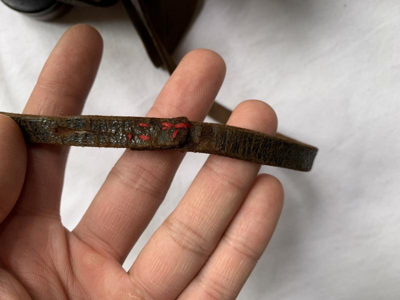 In nice condition a Wehrmacht Binoculars 'Dienstglas' 6x30 which is nicely factory code marked 'ddx', which comes with the original leather carrying strap (repaired) and original button flap.