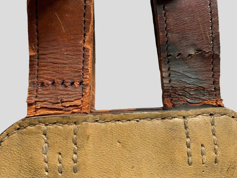 In used condition an Entrenching Tool Carrier Case made of Tan pressed cardboard construction, its nicely factory code marked 'kkd' and dated 1944. Unfortunately the leather strap is broken.