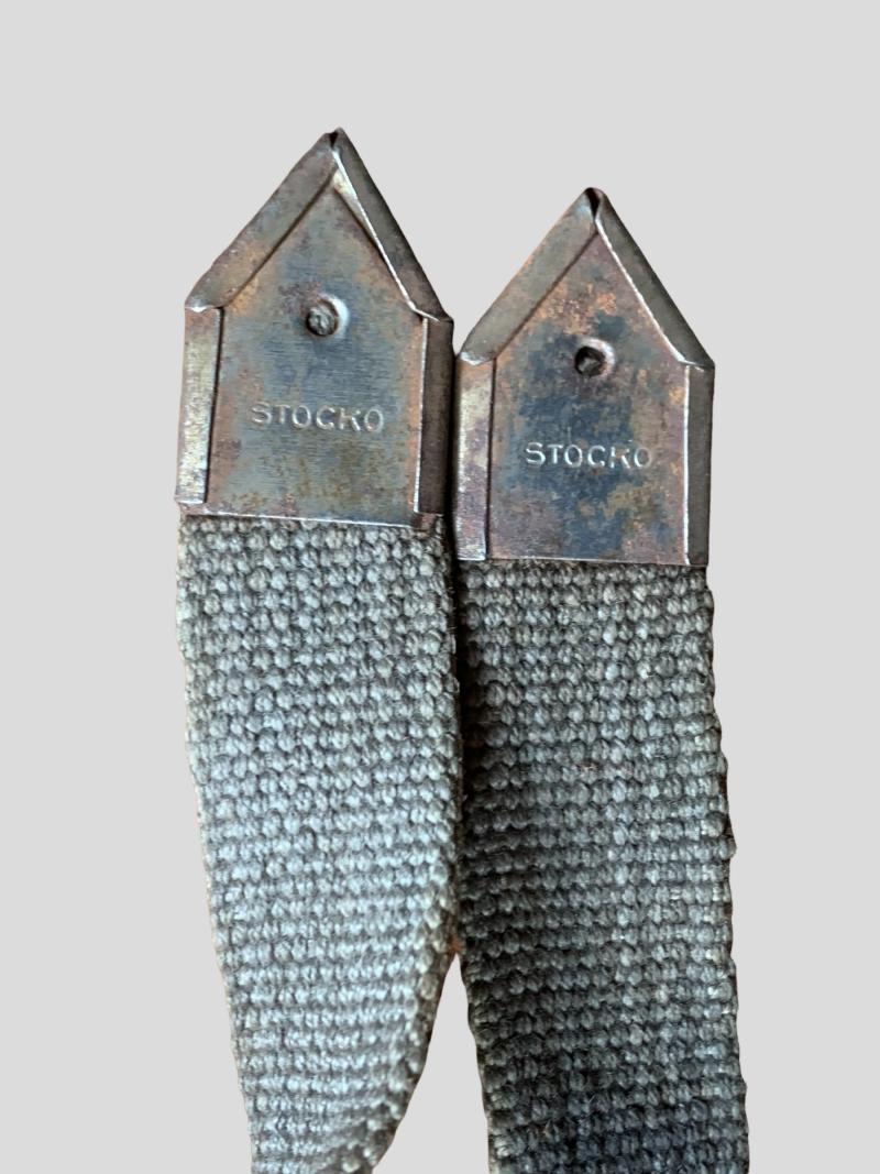 In nice used condition a pair of WH (HEER) / Waffen-SS Gebirgsjager 'Mountain Troops' Gaiters which are made of green canvas construction and webbing straps these are marked with 'stocko'.