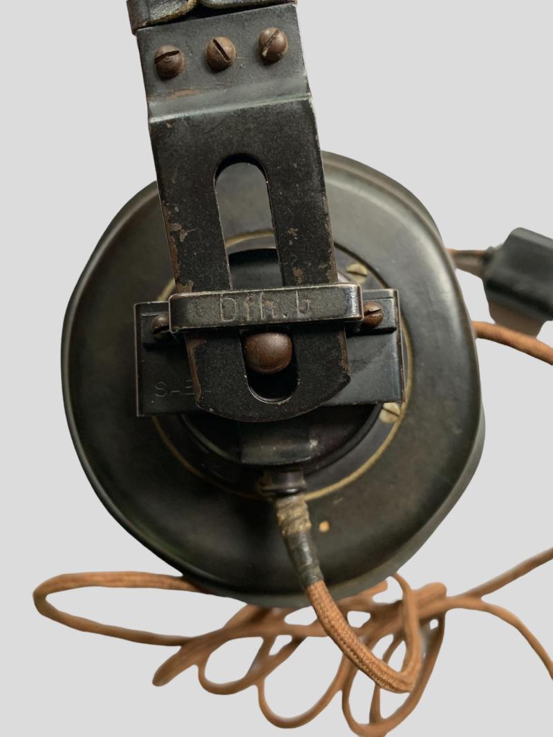In truly top condition a WH (HEER) Panzer Model B Headset. Its nicely marked 'Dfh.b' and dated '1943', also it comes with the 2 original rubber ear pads. Very nice example for sure!