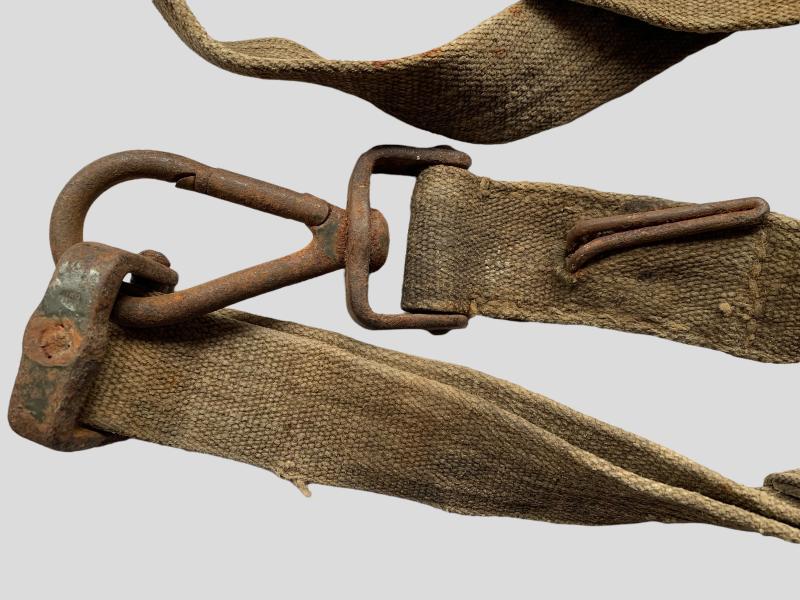 In nice used condition a MG 34/42 Ammunition Box Carrying Strap 'Tragegurt 34' war-time converted to a regular carrying strap, missing one hook. Nice for decoration!