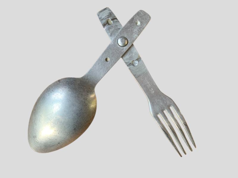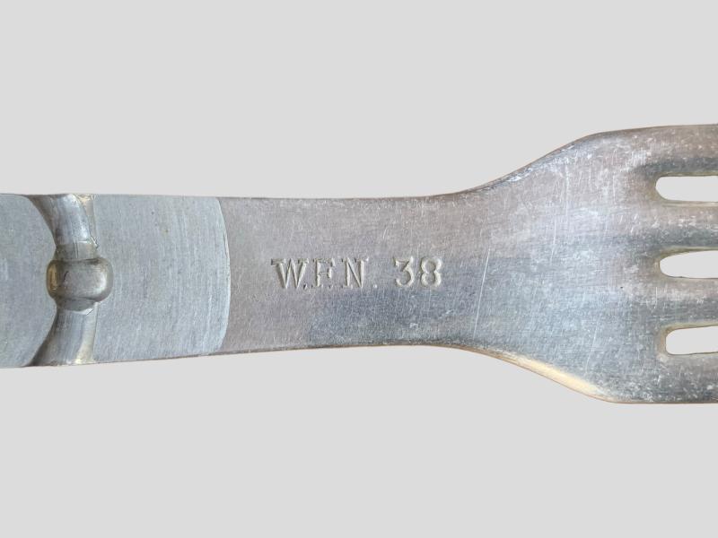 In nice condition a German WWII Fork/Spoon Combination made of aluminium which is nicely factory code marked 'W.F.N.' and dated '1938'.