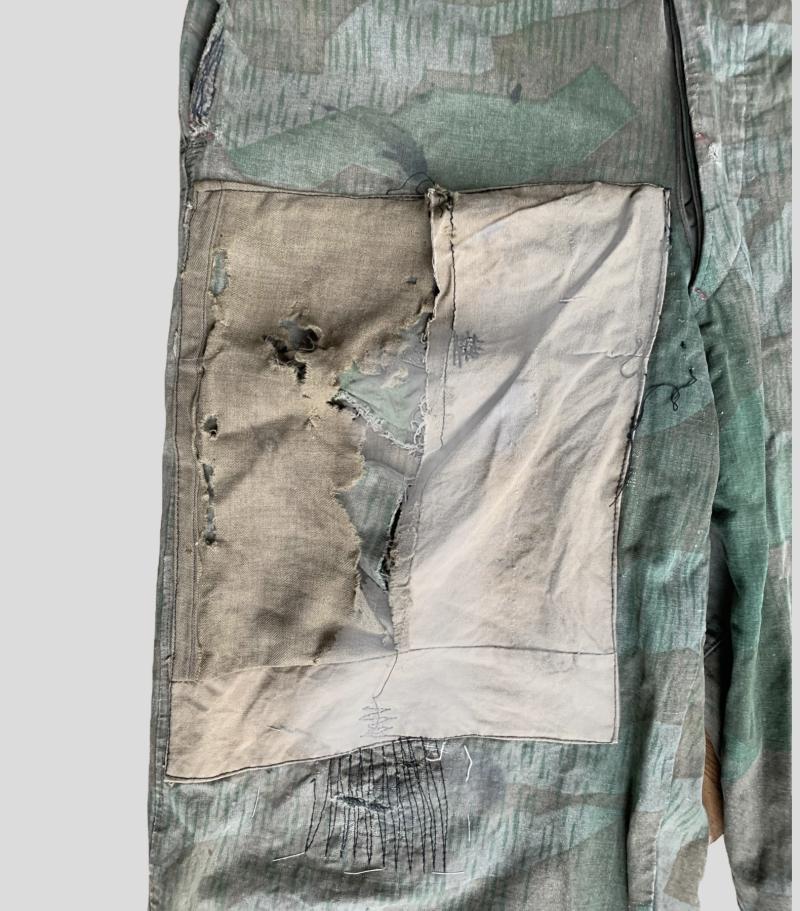 The self-made trousers and wrappers were often made of shelter quarters during the war for protection there own uniforms, this example is nicely named.