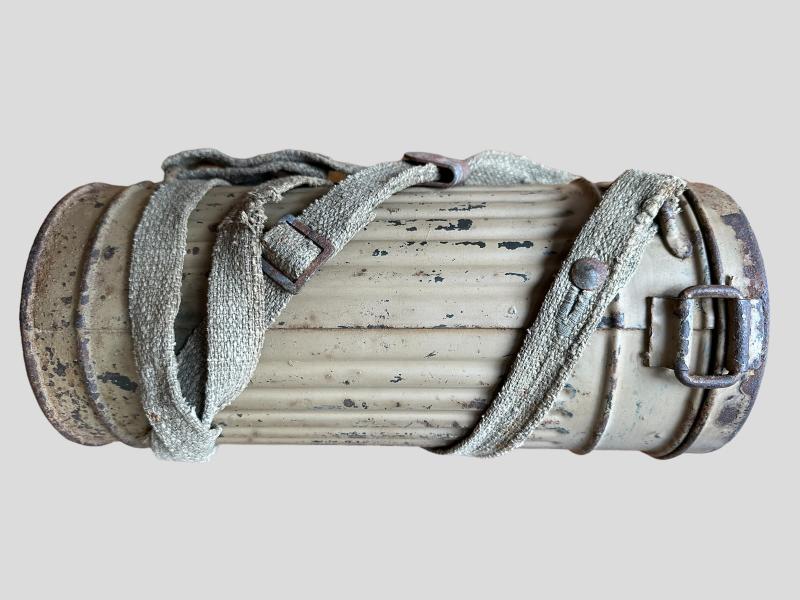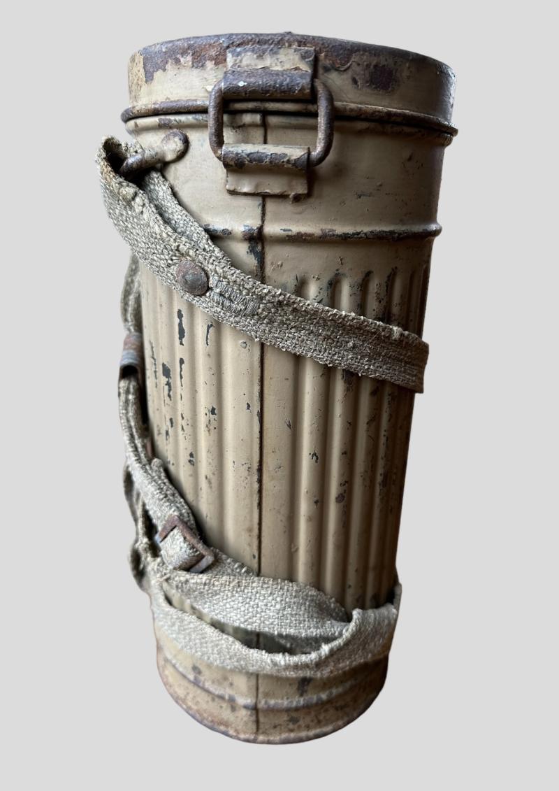 In really good condition a WH (HEER) Tan Painted Gasmask Canister, it retains more then 80% of its original tan paint. It comes with the original carrying sling. Very nice example for sure!