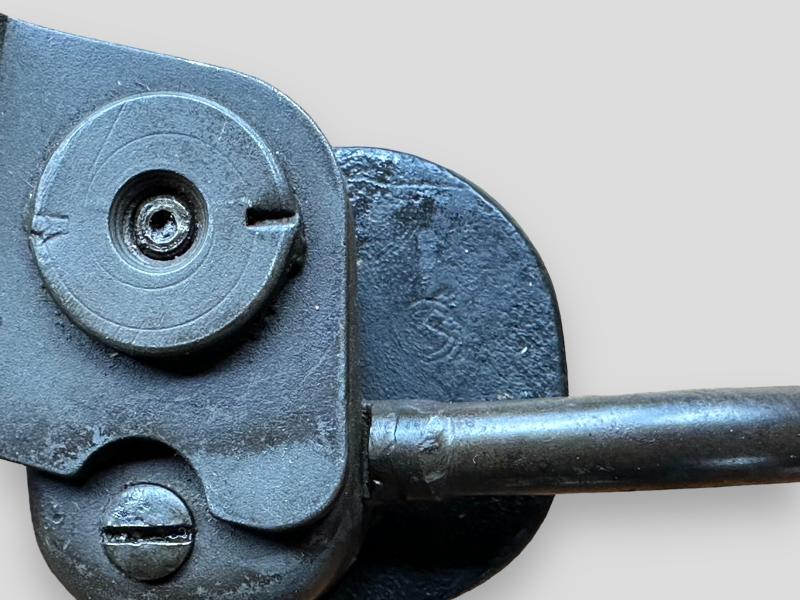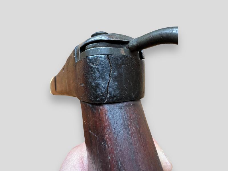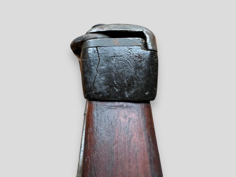 The Leather cheek pad that is attached to the stock is secured by 3 steel rivets and inside of the metal buttplate had a drawing number cast 'B257614' and 'circle' marked (wagon wheel).