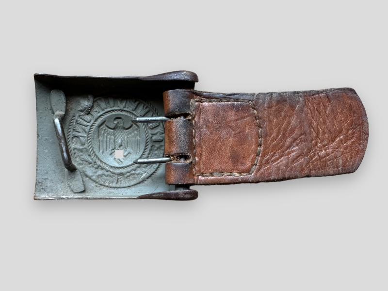 In really good condition a WH (HEER) Steel Belt Buckle whith original leather tab, nicely maker marked and dated.