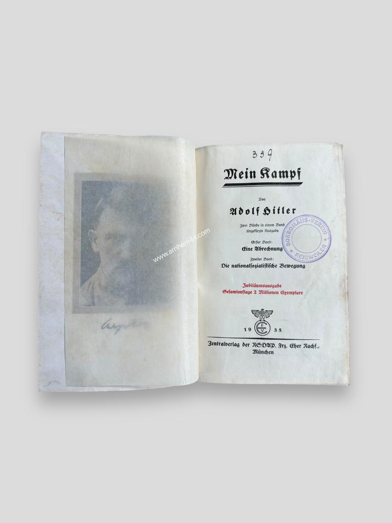 In very good condition an early example of Adolf Hitler's Mein Kampf dated 1935, all pages are intact. This example will be sold to collectors and is intended for historical and research purposes only.