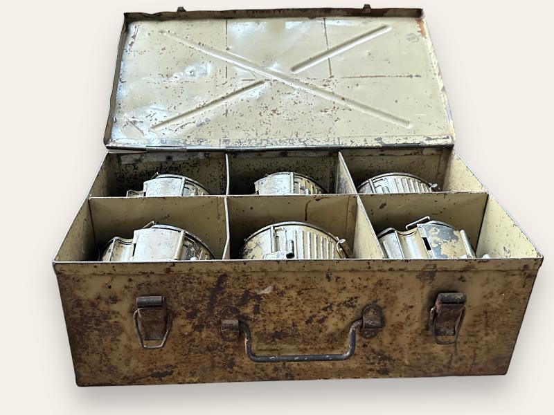 Very attractive MG34/42 Armored Vehicle Drums in Case which can hold 6 drums. The case retaining more then 70% of its original paint, as well the drums does.