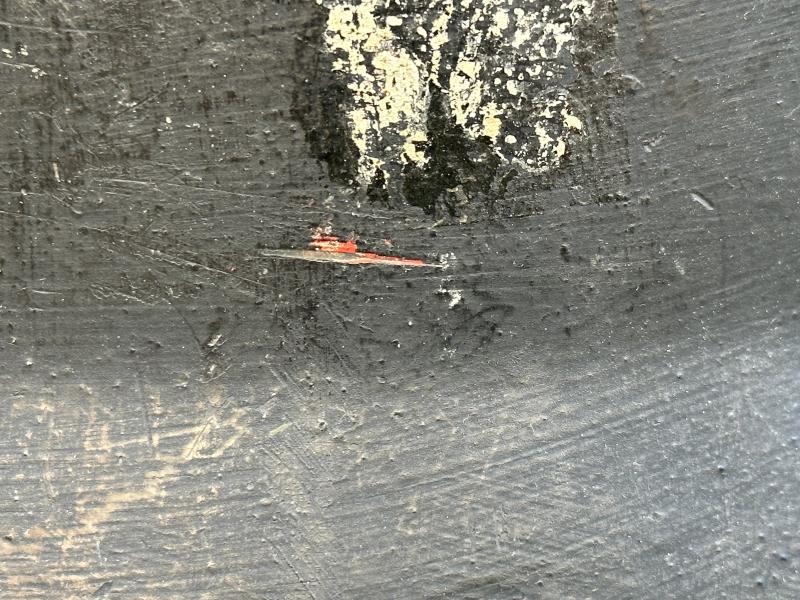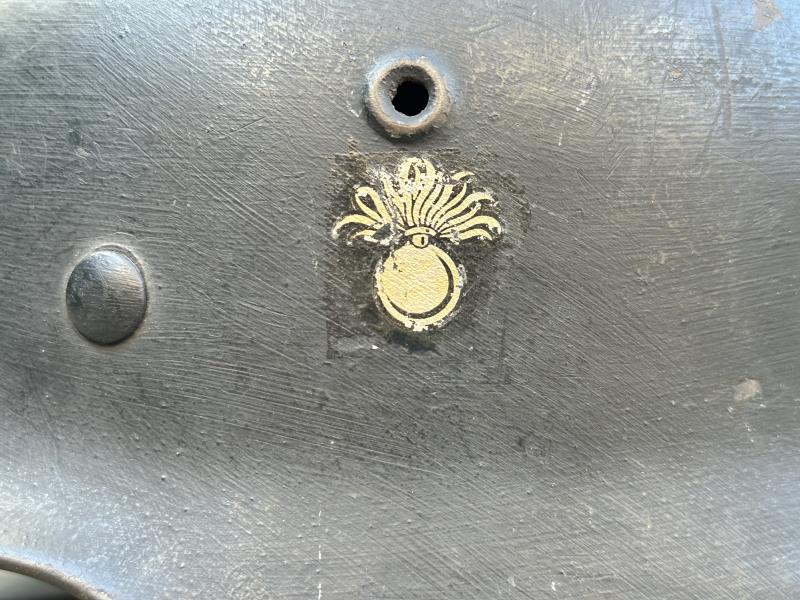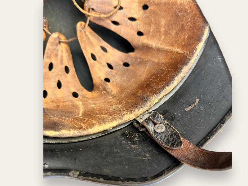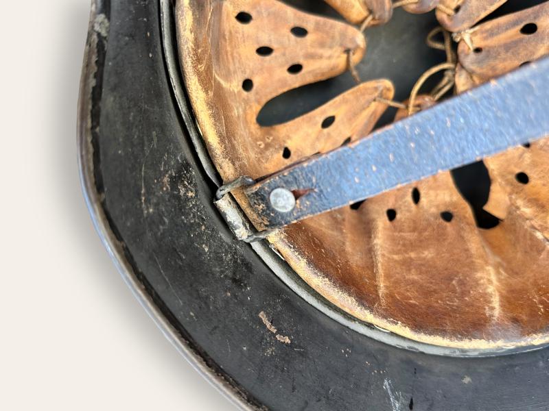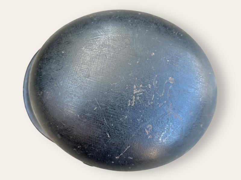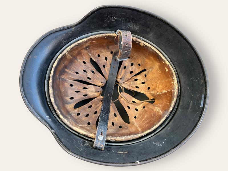 Original overpainted in black, with added Dutch lion and flaming bomb decals placed over the originals (traces underneath visible), complete with liner and chinstrap, very rare example