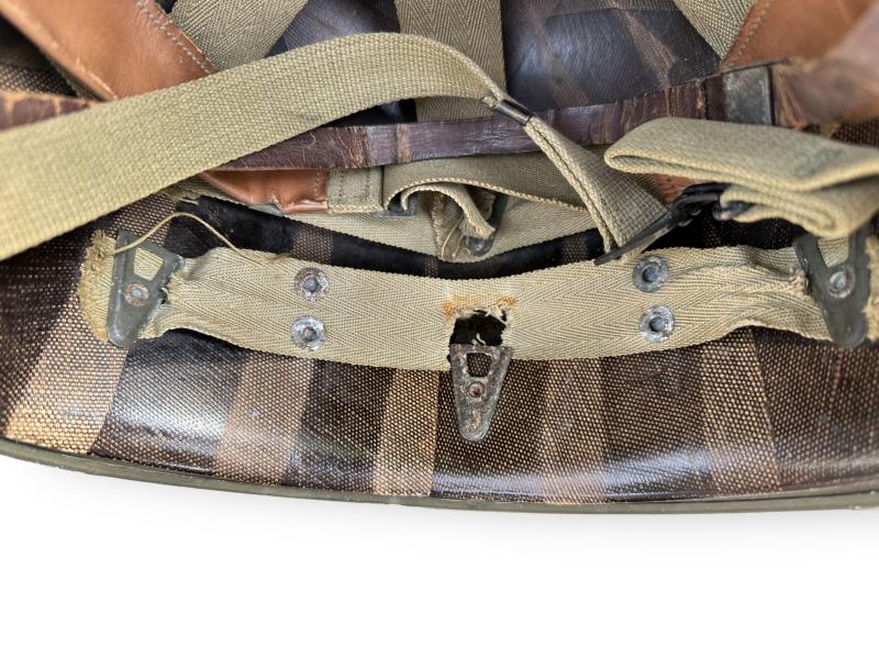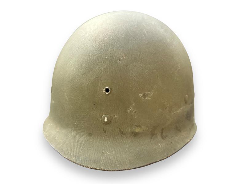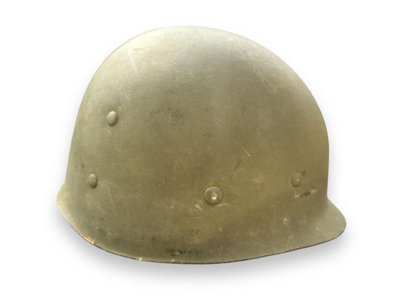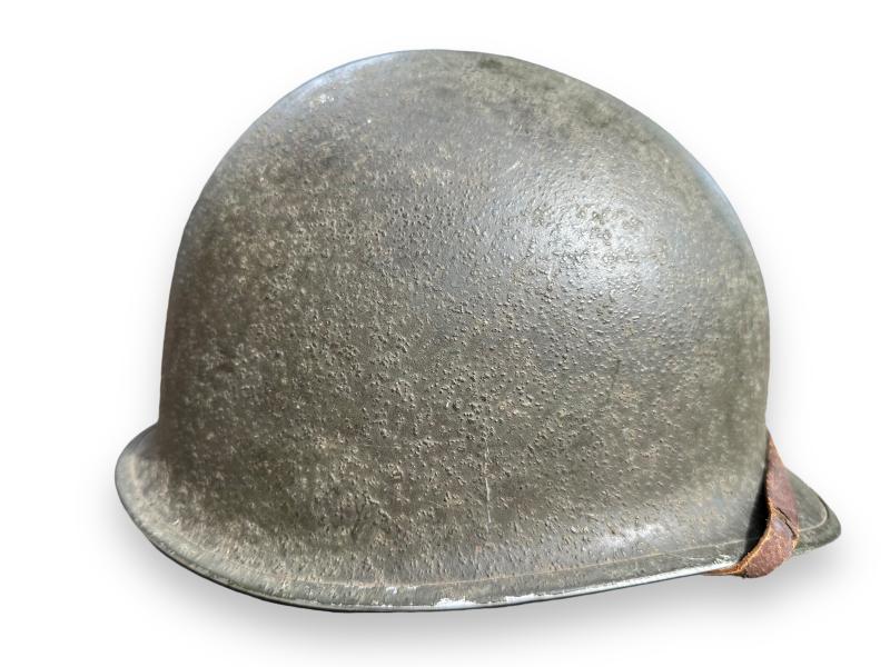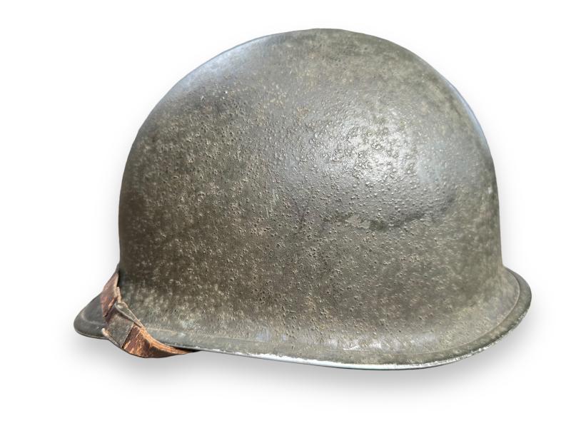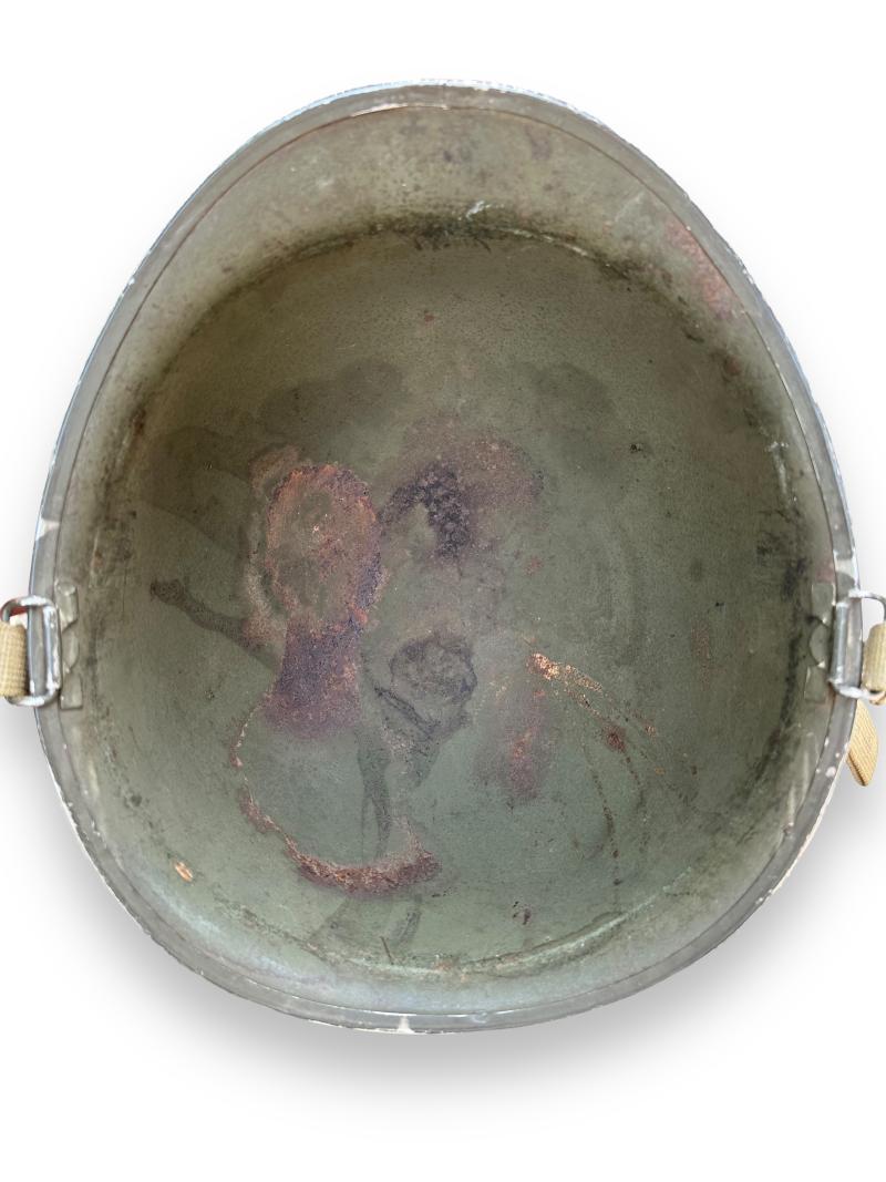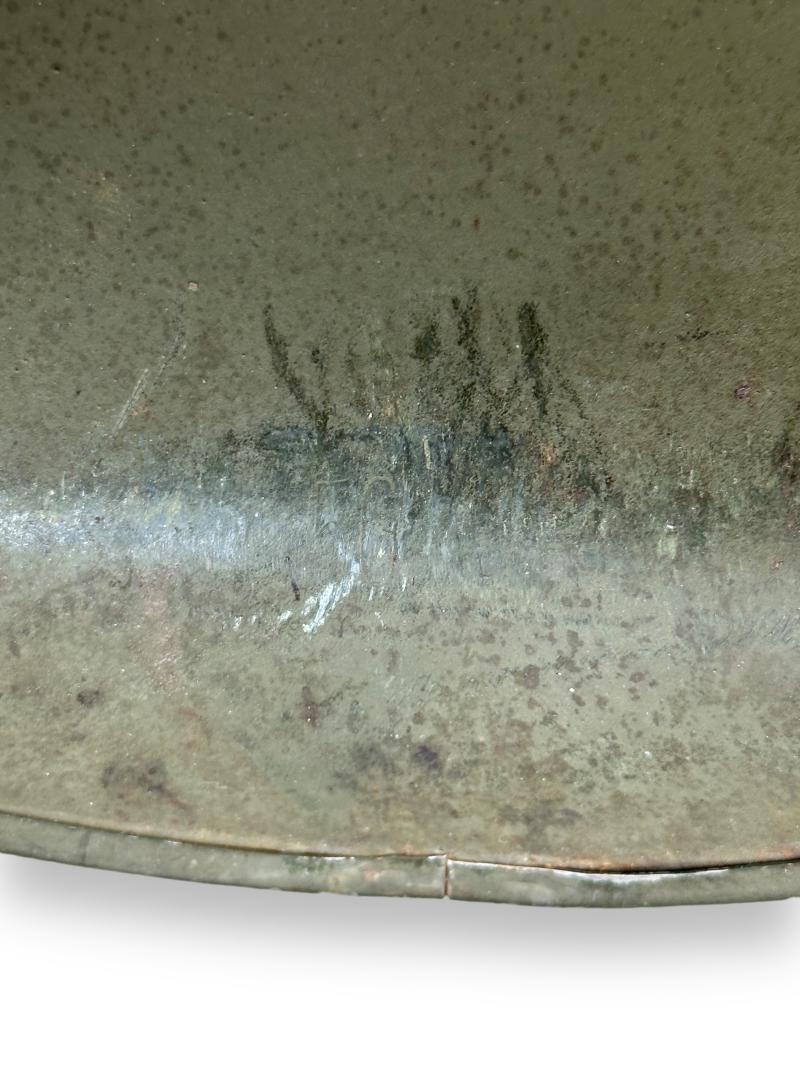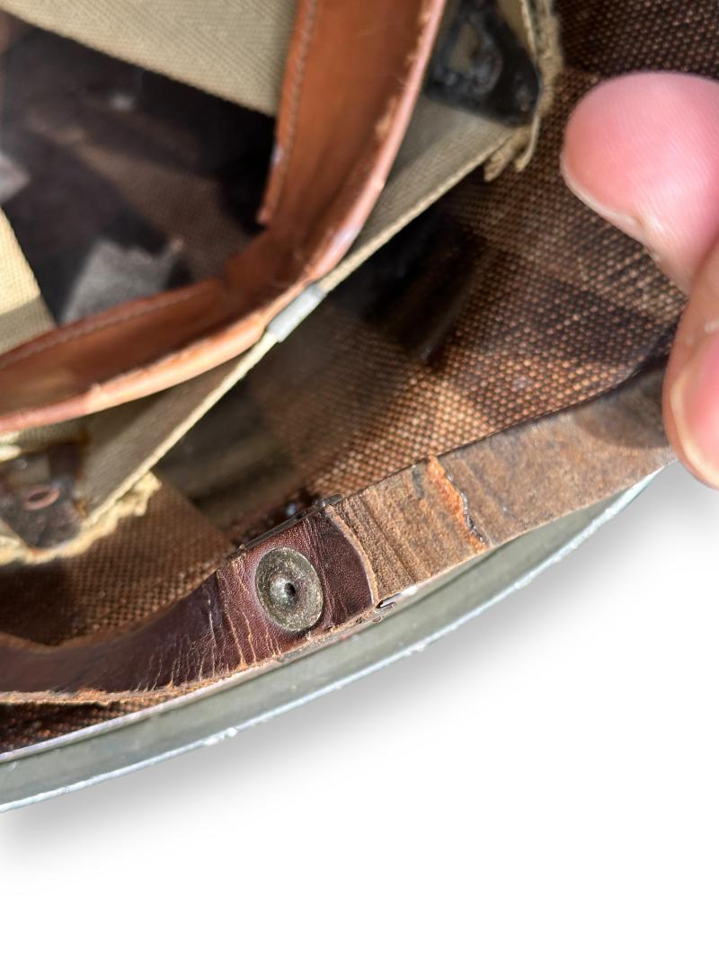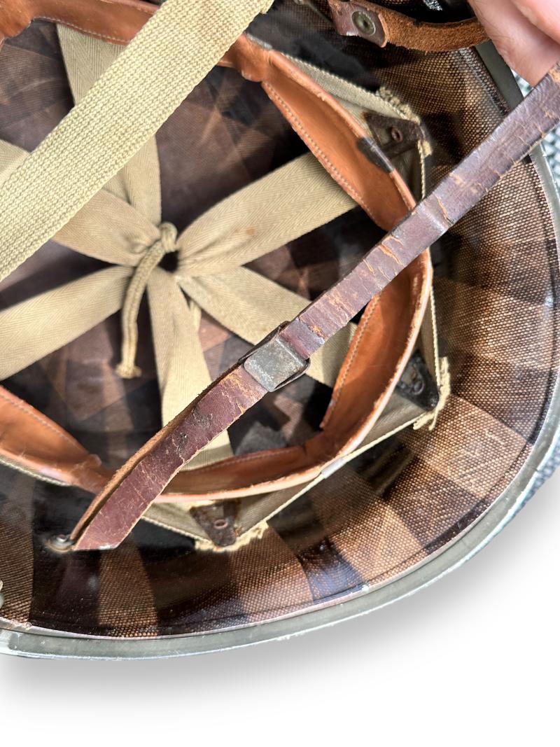Nice complete US M1 Swivel Bale helmet which retains more then 90% of its original factory paint. It comes with the liner which is made by westinghouse, leather chin strap has been repaired once.