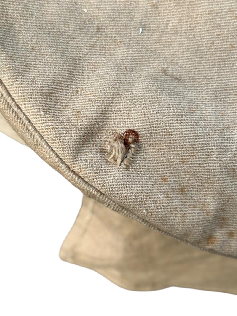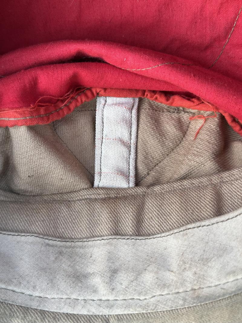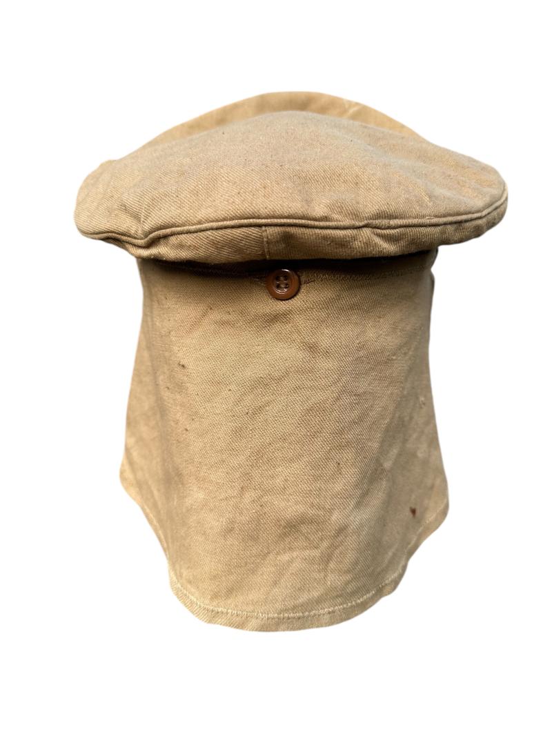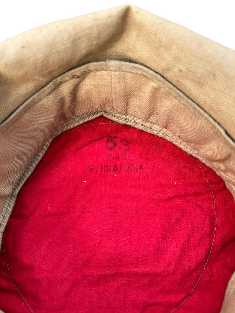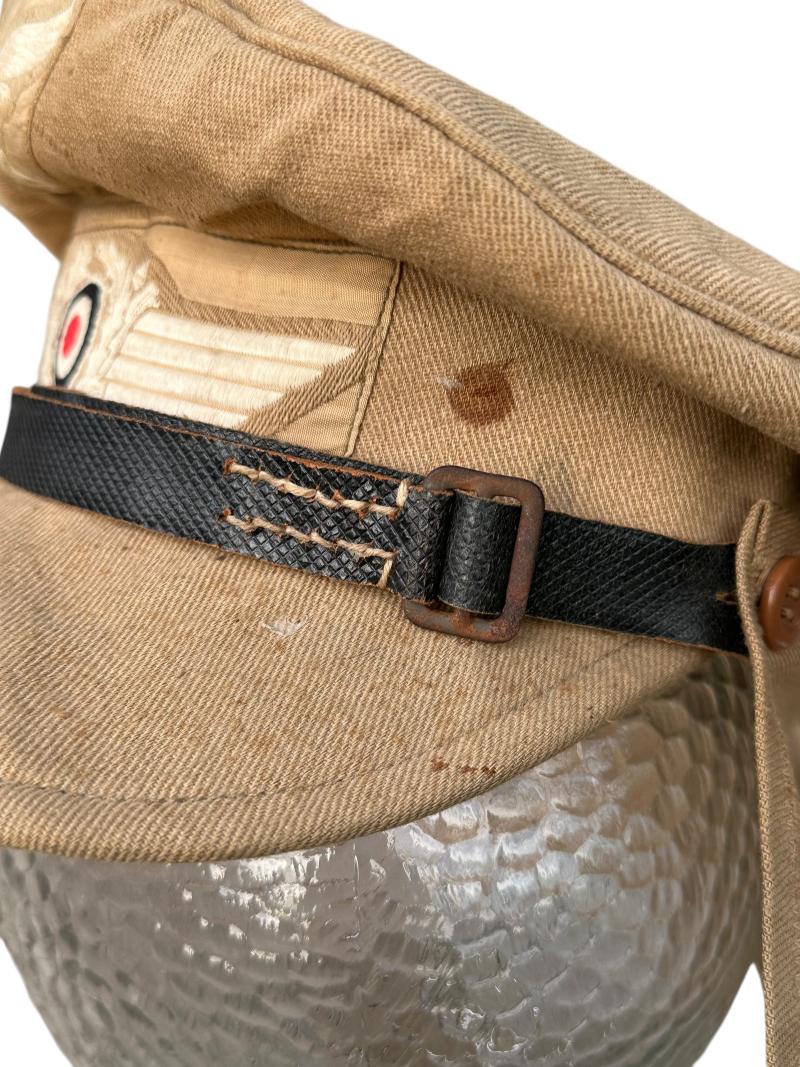 Very nice and rare Luftwaffe Tropical 'Hermann Meyer' Visor Cap which comes with it's original factory sewn insginia, leather chin strap (sturmriem) and neck guard still attached.