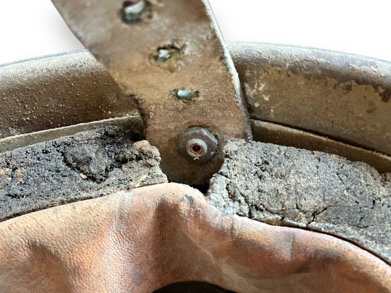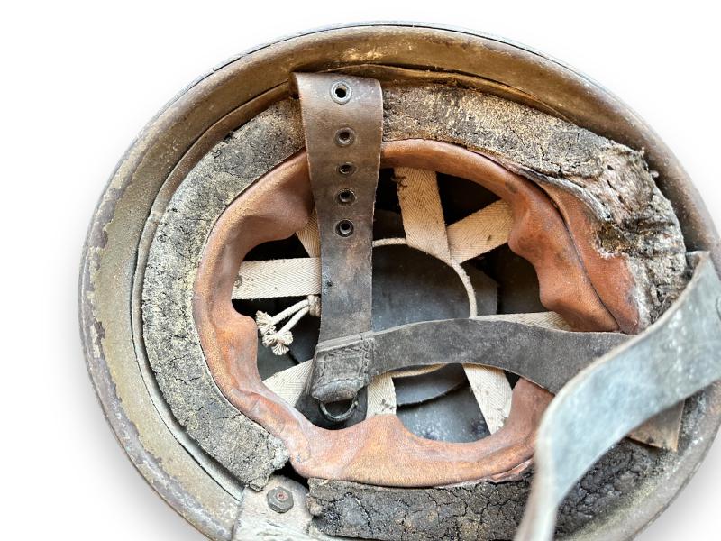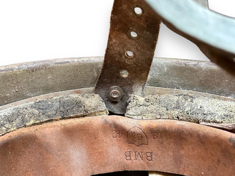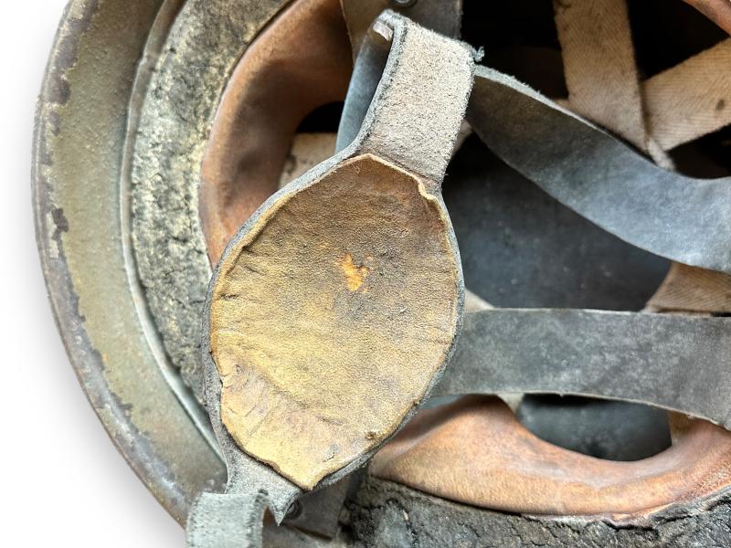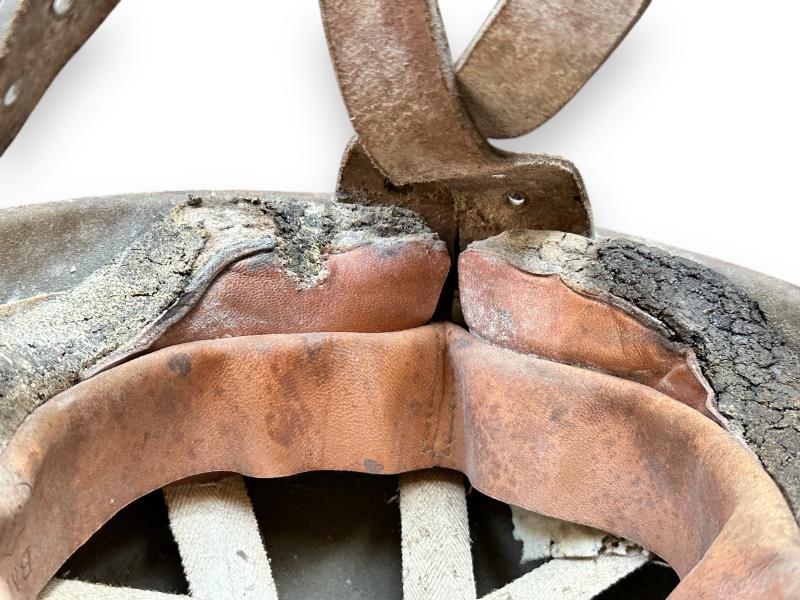 The liner is nicely maker marked and dated, chin strap and sweatband are in nice supple condition.