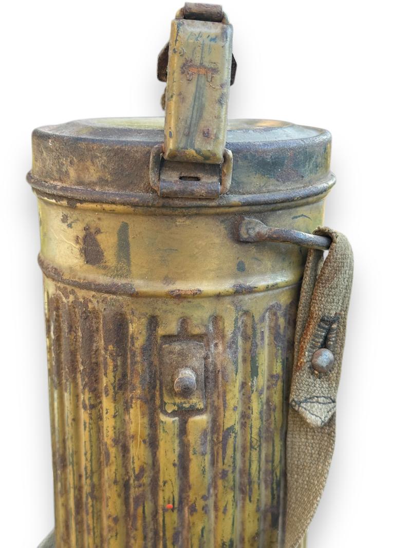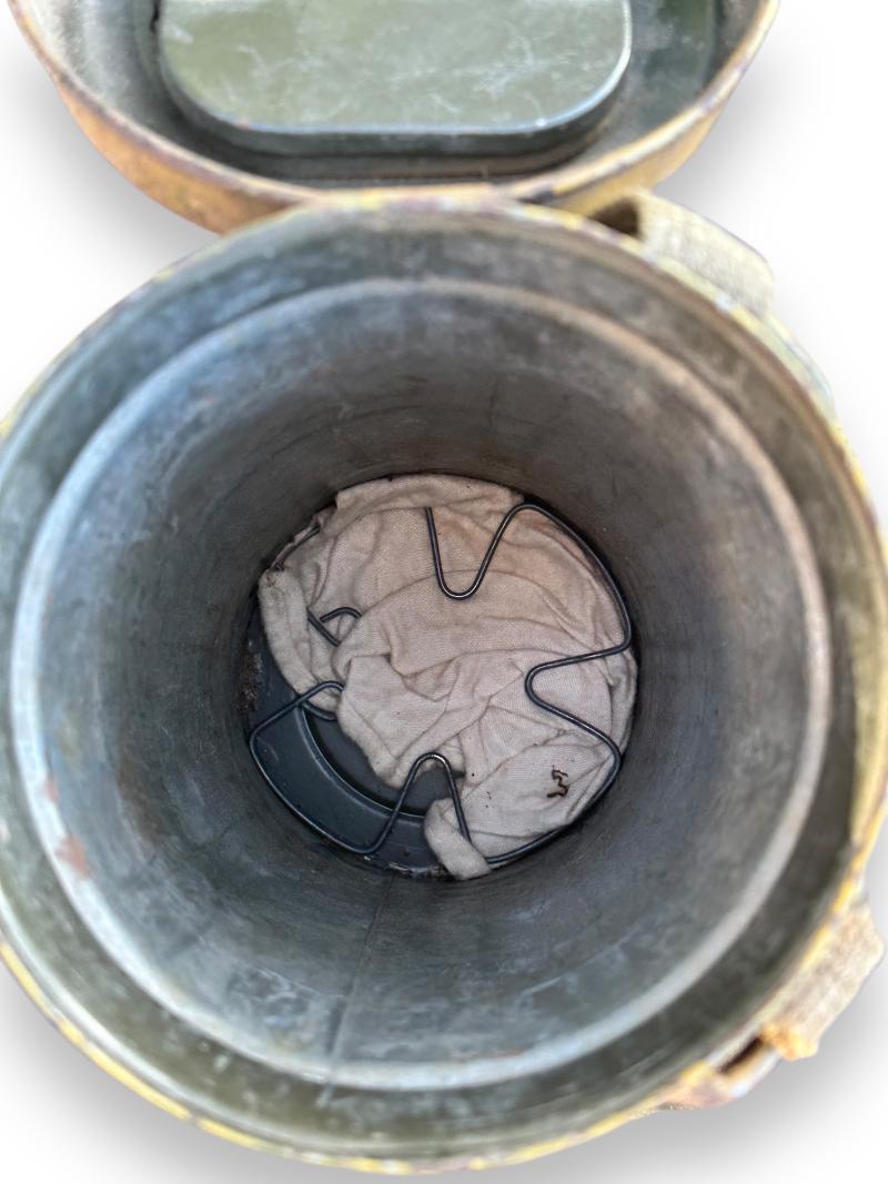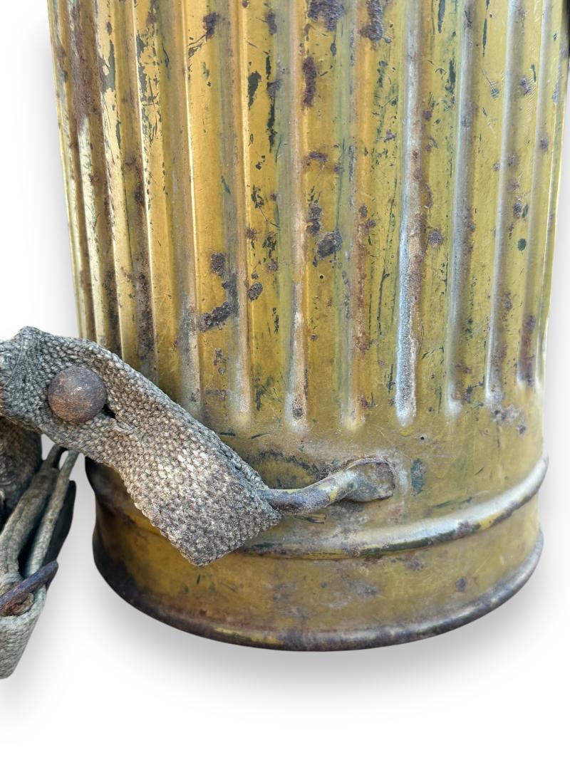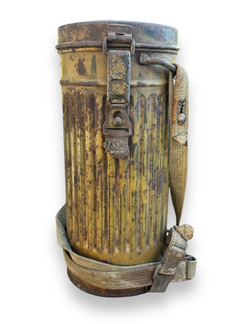 The canister retains well over 90% of the camouflage finish and comes with the original carrying strap and matching number gasmasker and 'Tropen' gasmasker filter.