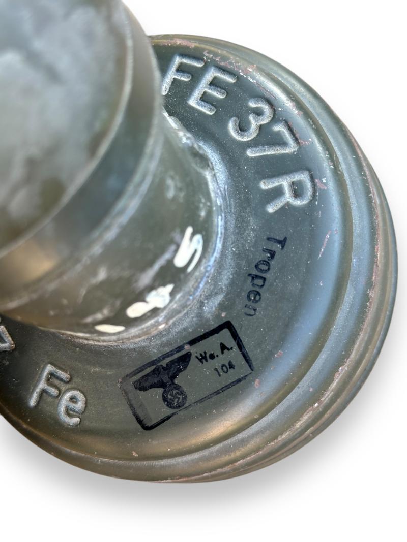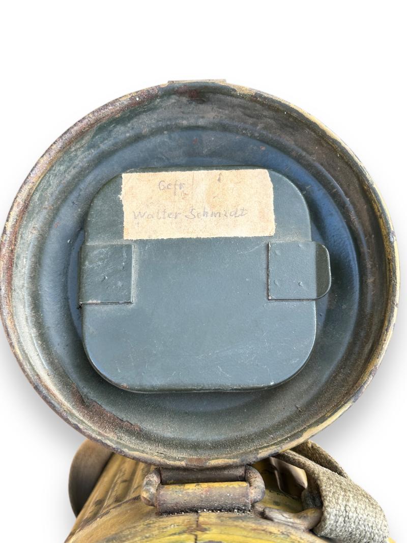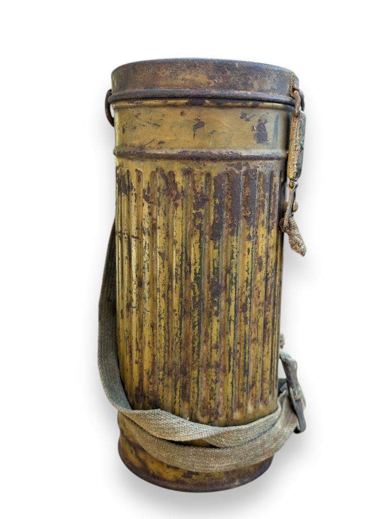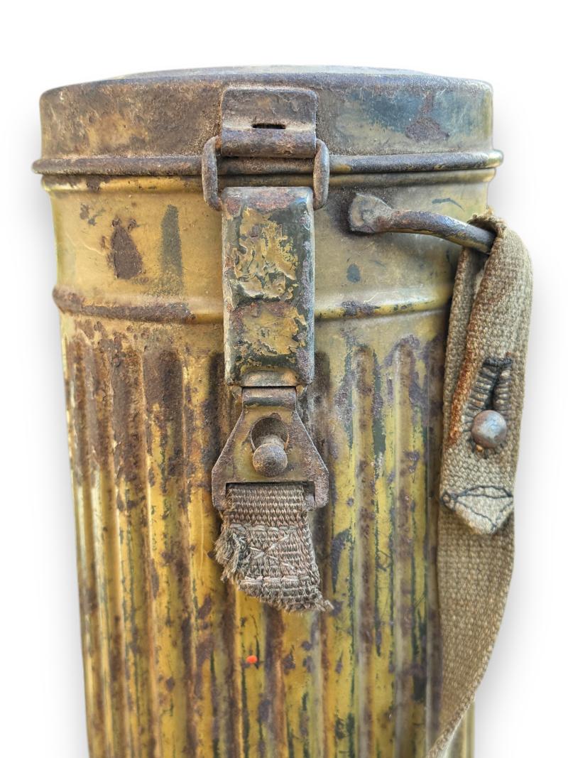 The canister retains well over 90% of the camouflage finish and comes with the original carrying strap and matching number gasmasker and 'Tropen' gasmasker filter.
