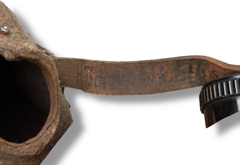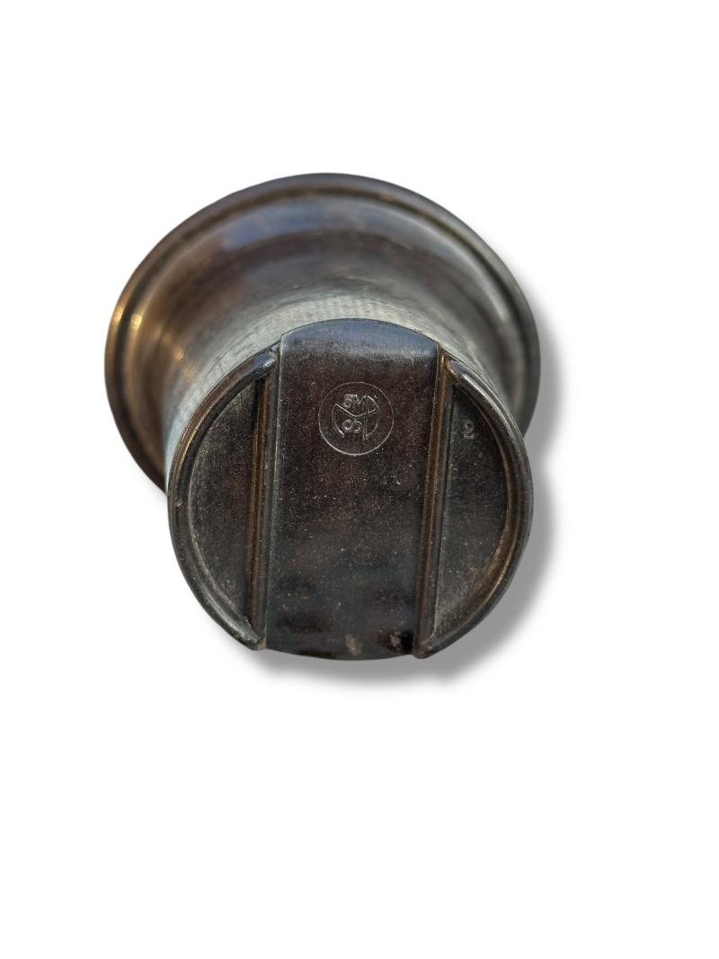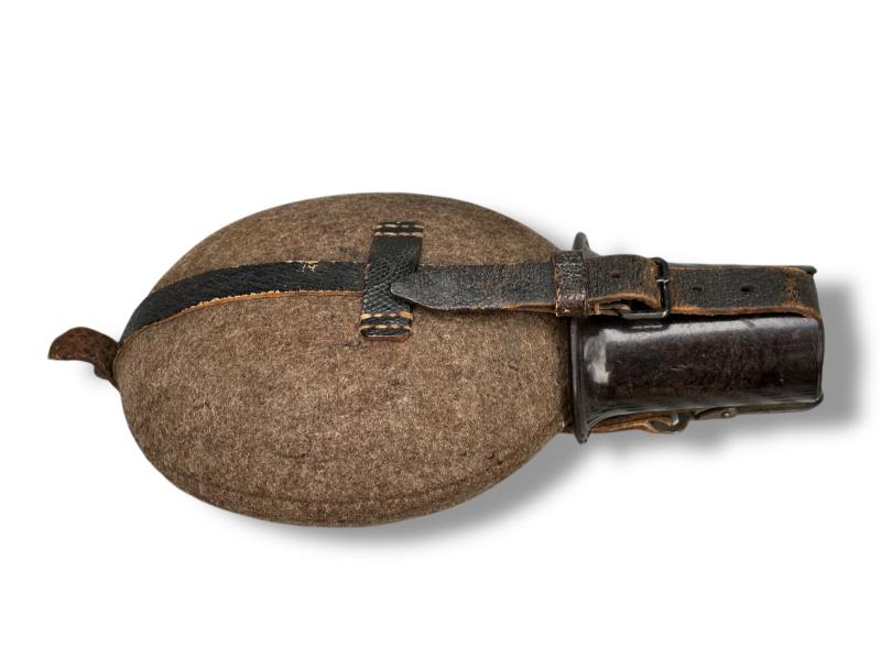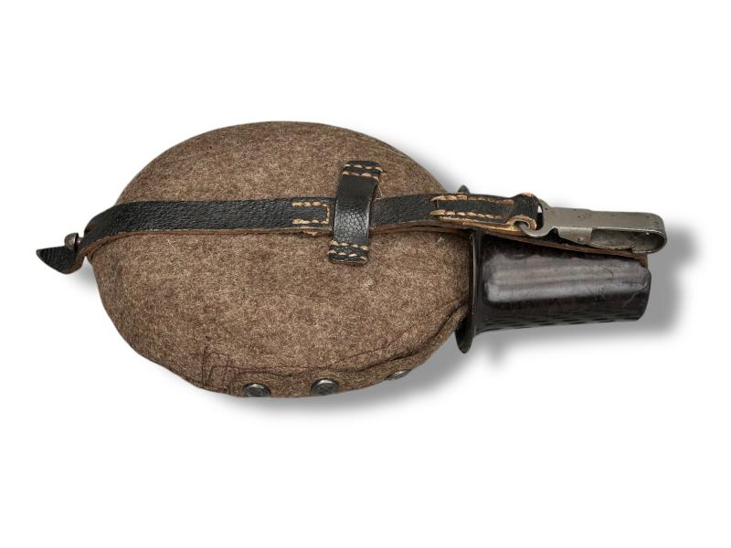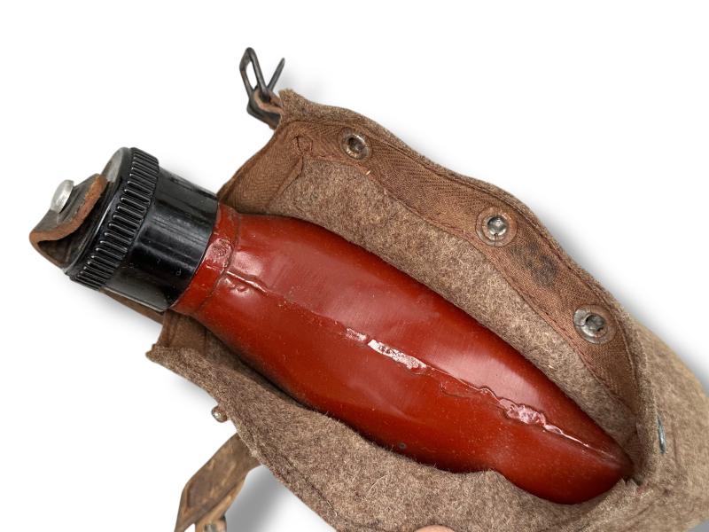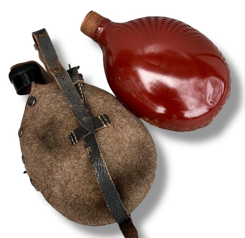 This is a rare chocolate brown Bakelite canteen cup, a unique color variant that is difficult to find. The cup comes with its matching field canteen, which is also in excellent condition. This particular mix of colors is much less common compared to the standard versions, making this a great find for collectors of field gear.