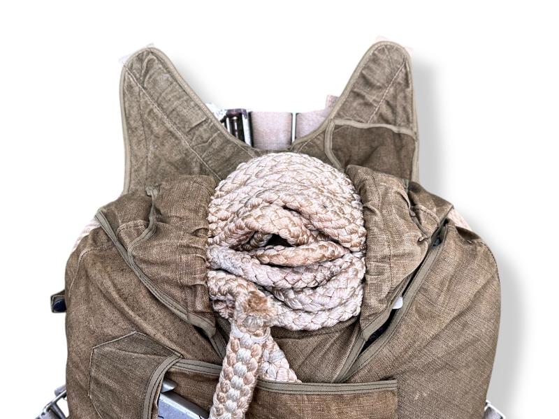 This is an incredibly rare, un-issued Fallschirmjäger RZ20 harness and bag set, unpacked and in its original condition. The set is complete with the Harness System, Static line, Camouflaged Canopy, Parachute Deployment Bag, and Outer Bag and never been opened, making it a truly exceptional find.