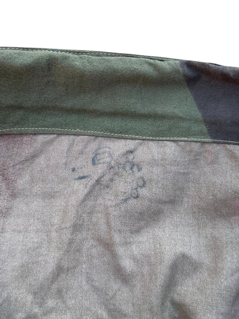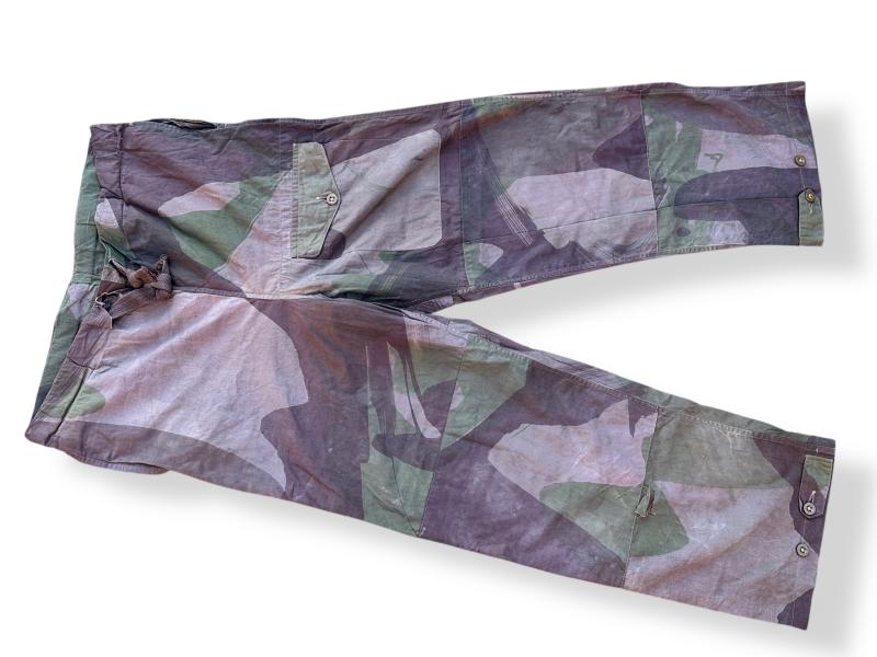 This pair of British windproof trousers is in excellent worn condition, featuring the original attached label, marked with size 5 and dated 1943. The trousers show clear signs of wear, which are visible in the photos, reflecting their authentic history and use during World War II.