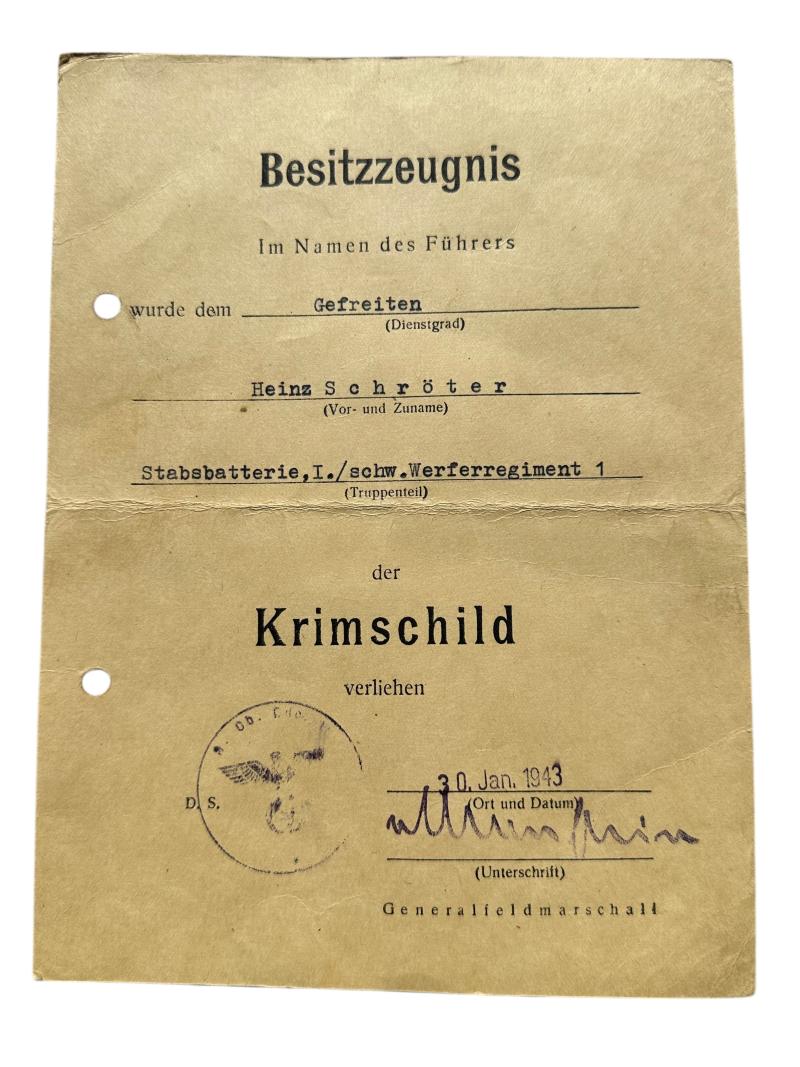 Very nice Campaign Shield or 'Krimschild' with Award document 'Urkunde'.