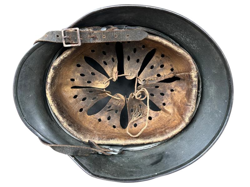 The original leather liner remains supple and complete, showing natural wear. The helmet also comes with its original chin strap.