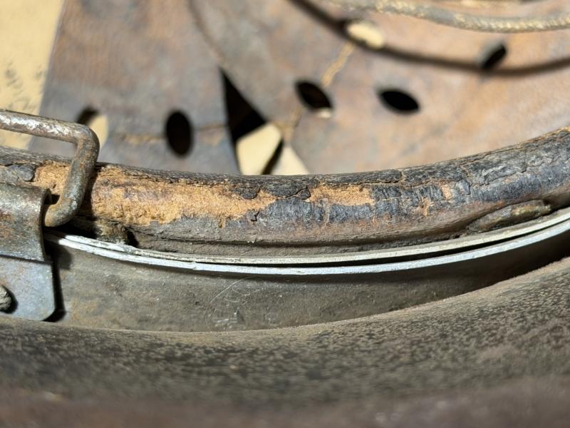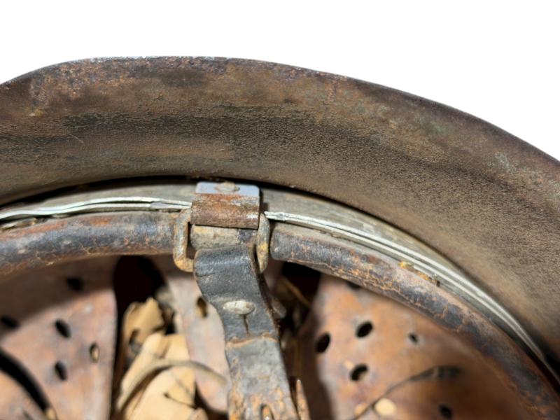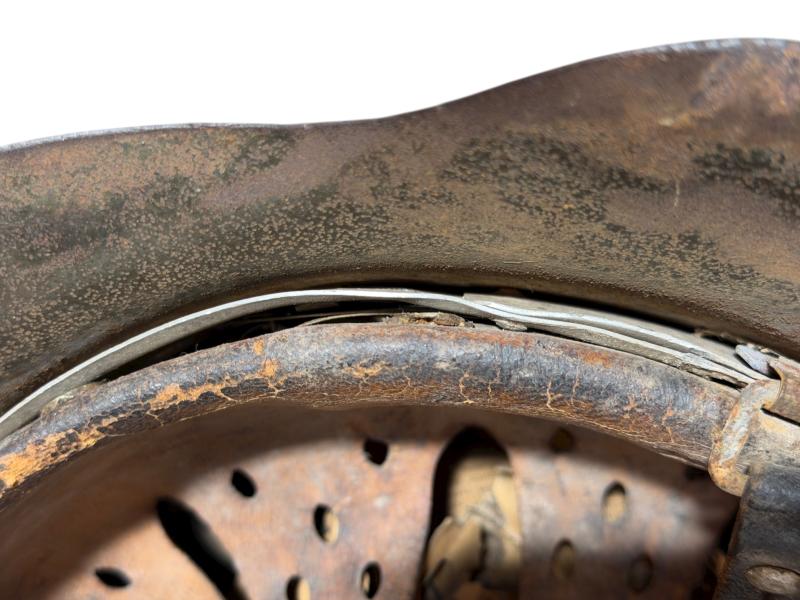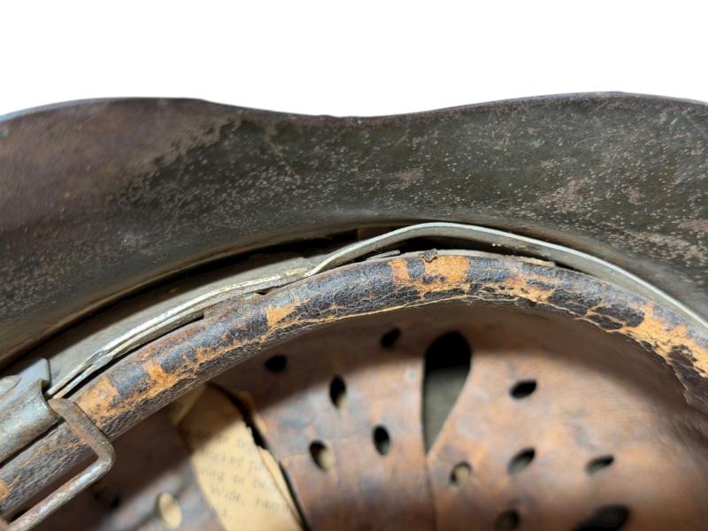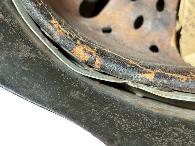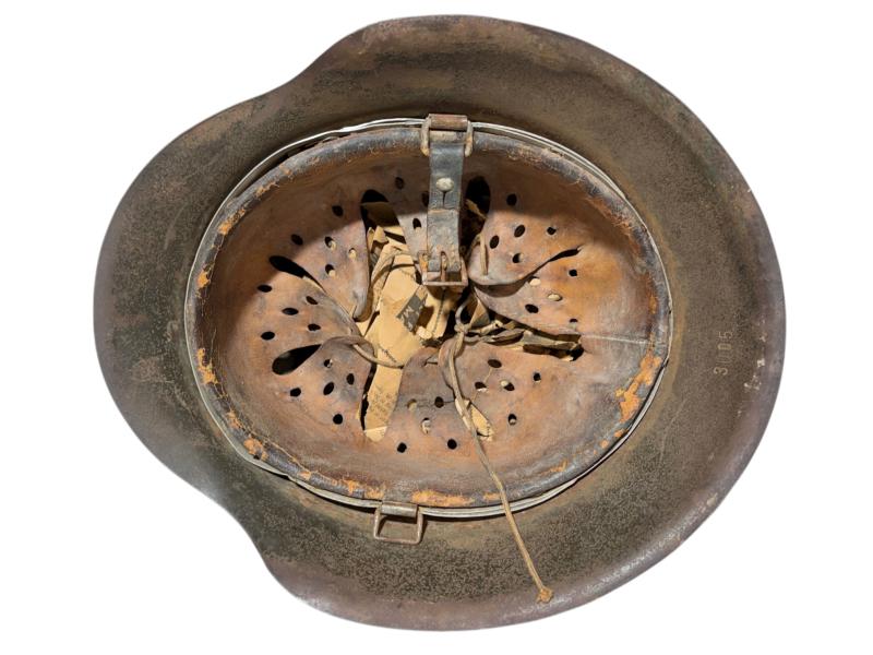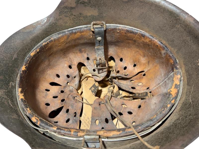 A superb example that has not been cleaned, retaining its original field-applied camouflage. The Wehrmacht decal is still visible beneath the paint. Comes with its leather liner dated 1943, which remains supple and not dried out. Nicely maker marked and serial numbered.