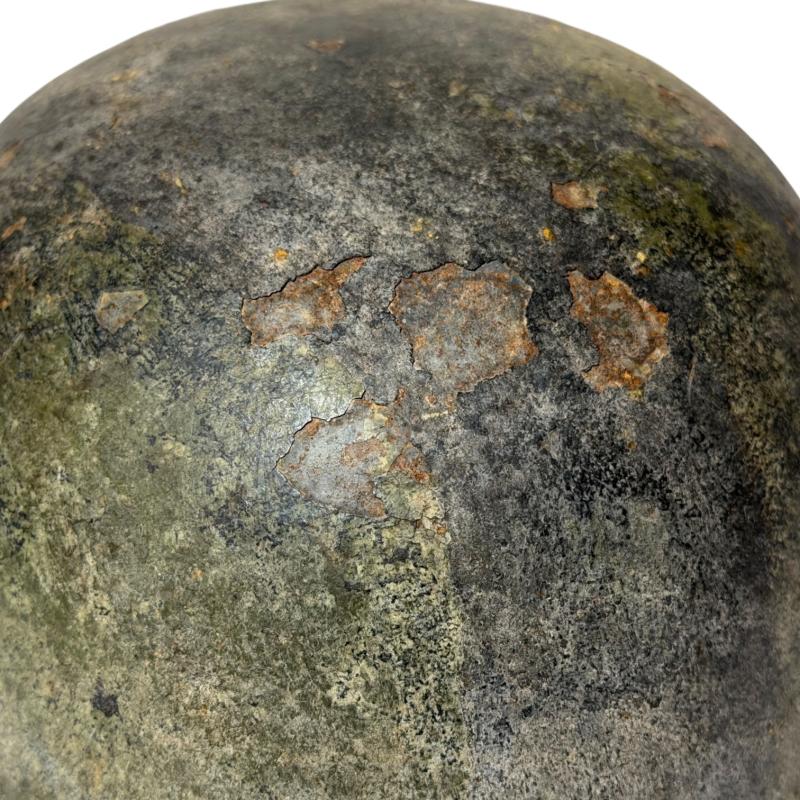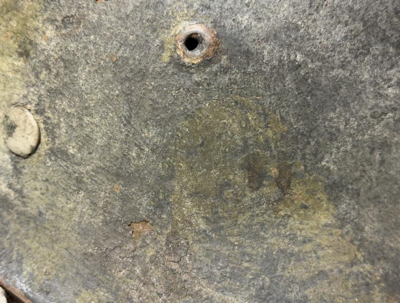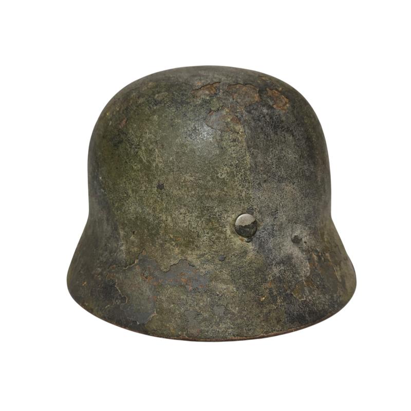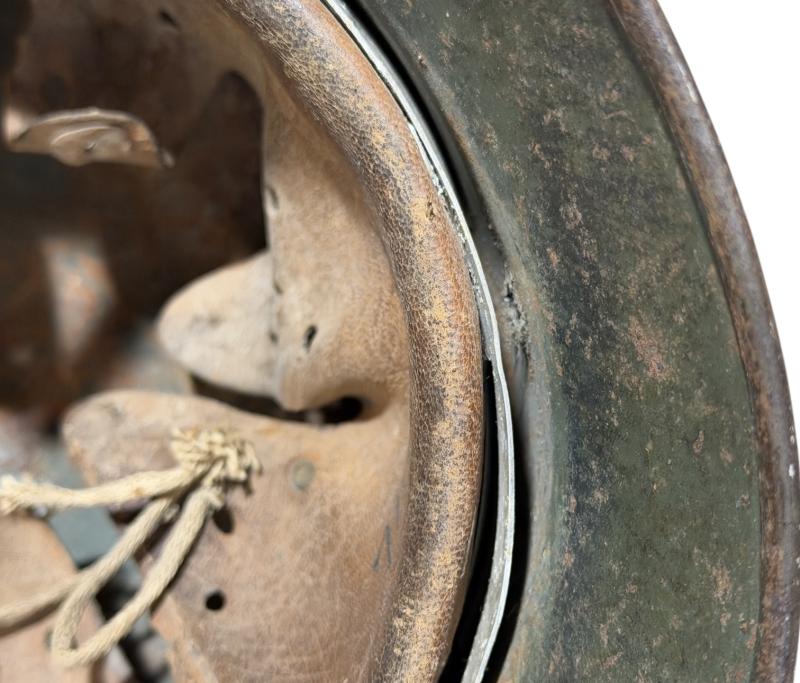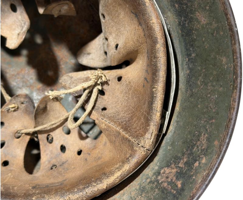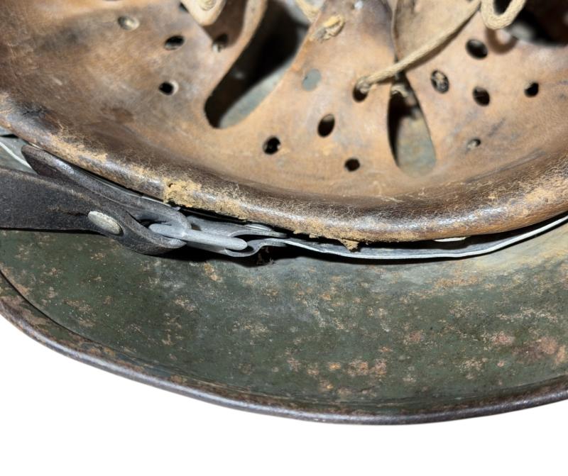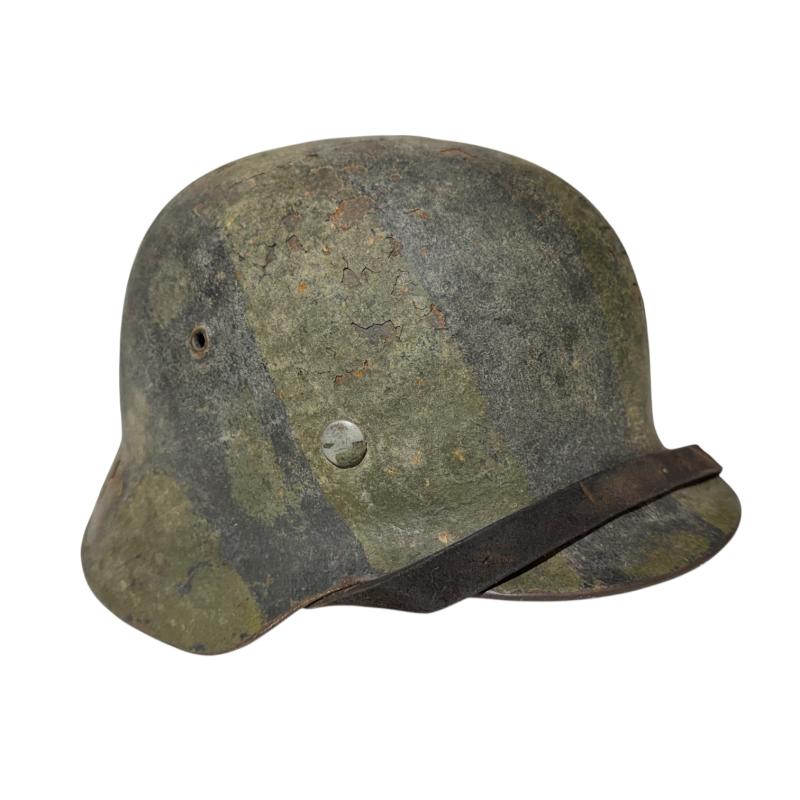 Super nice and untouched M35 helmet featuring a fantastic camouflage paint. The original decal is still clearly visible beneath the camouflage paint.