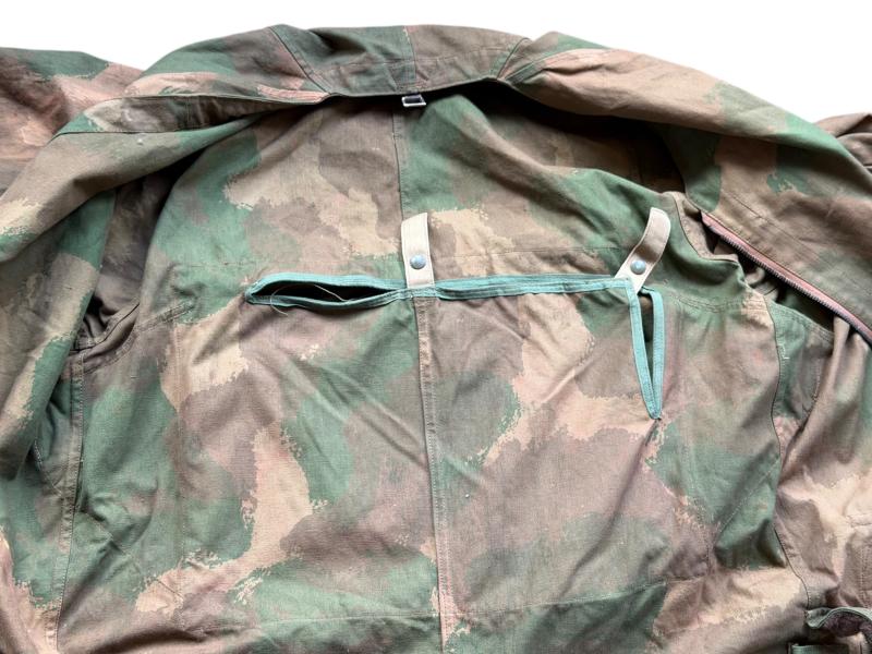 The overall is made from heavy cloth with a hand-screened camouflage pattern, showing beautiful, bright colors. This used example remains in good condition and retains three of its original zippers. All zippers are original to the piece, complete with three pull tabs, in good working condition. The jumpsuit is size stamped “2” and comes with the original cushion that belongs to the rear of the suit.