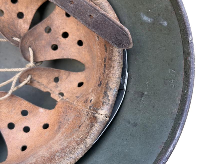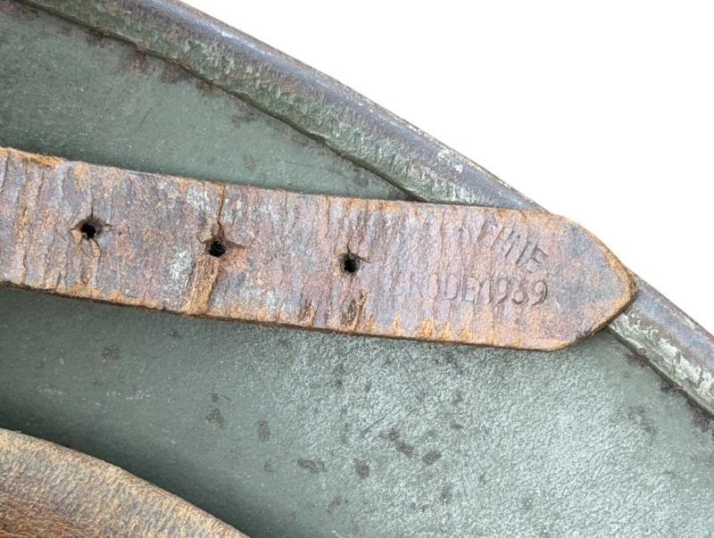 The shell is clearly factory code and size marked. The leather liner is in good condition, still supple and not dehydrated. The leather chinstrap is nicely maker-marked and dated 1939.
